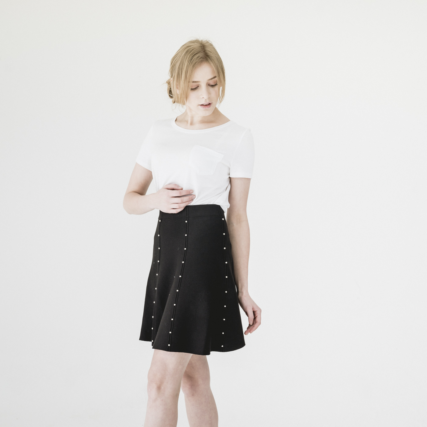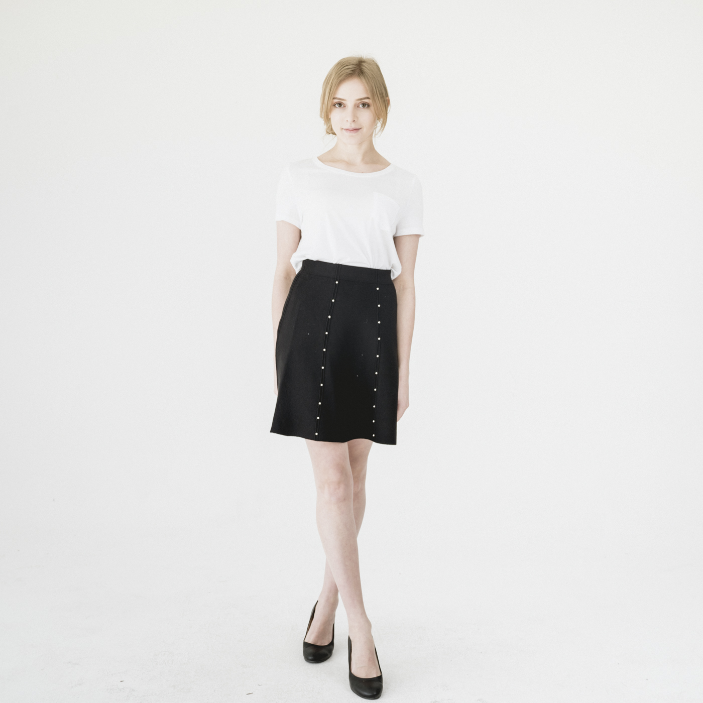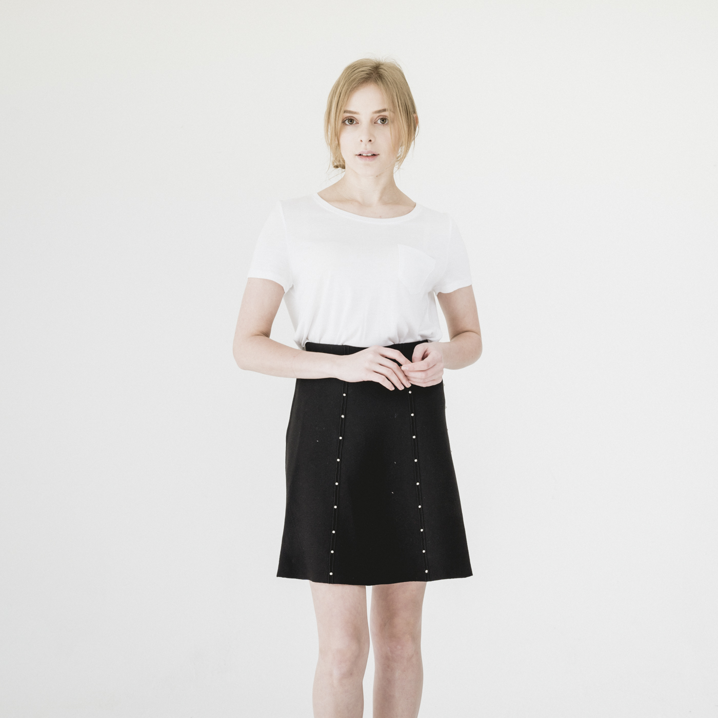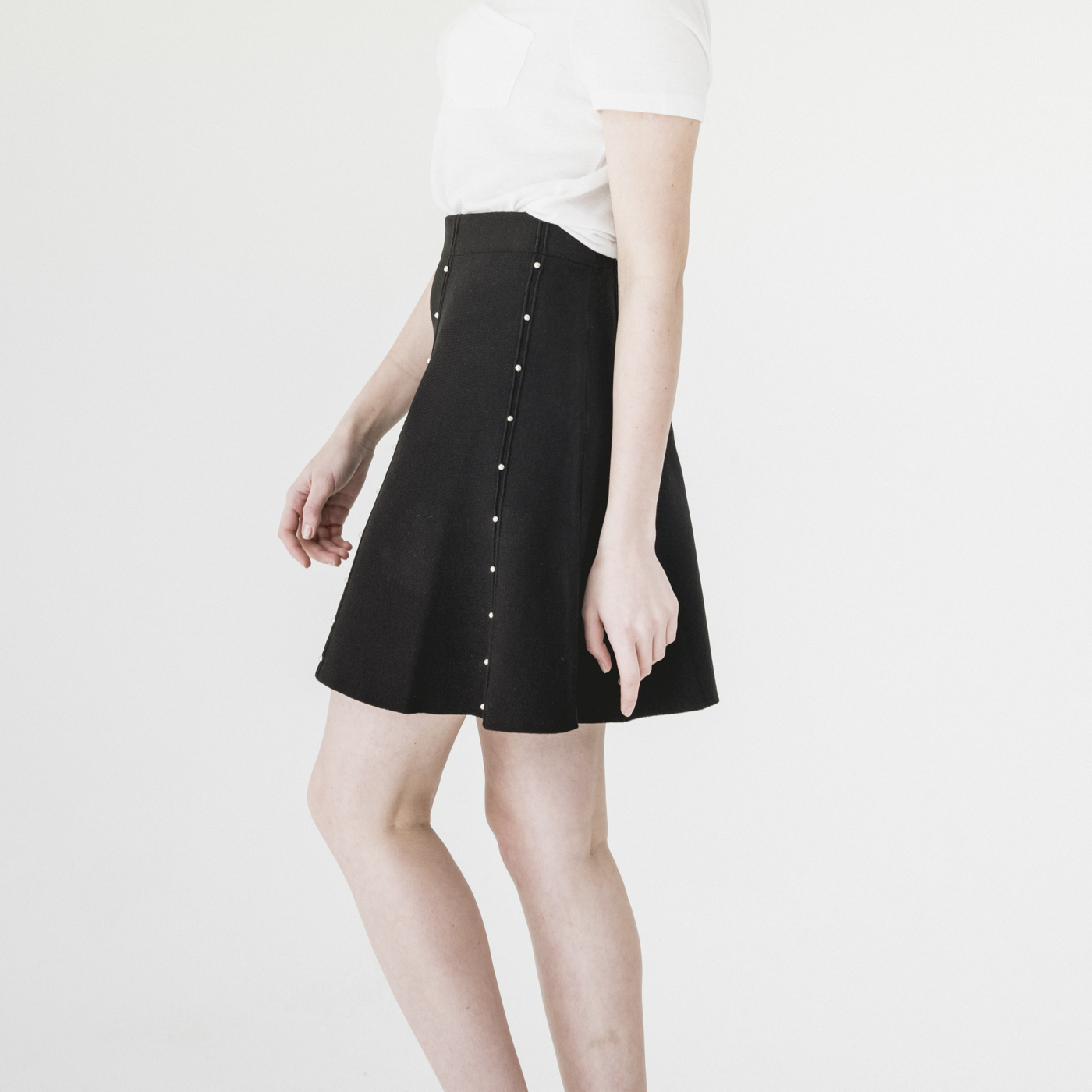진주 포인트 디자인의 고급스럽고 슬림한 스타일의 니트 스커트입니다.