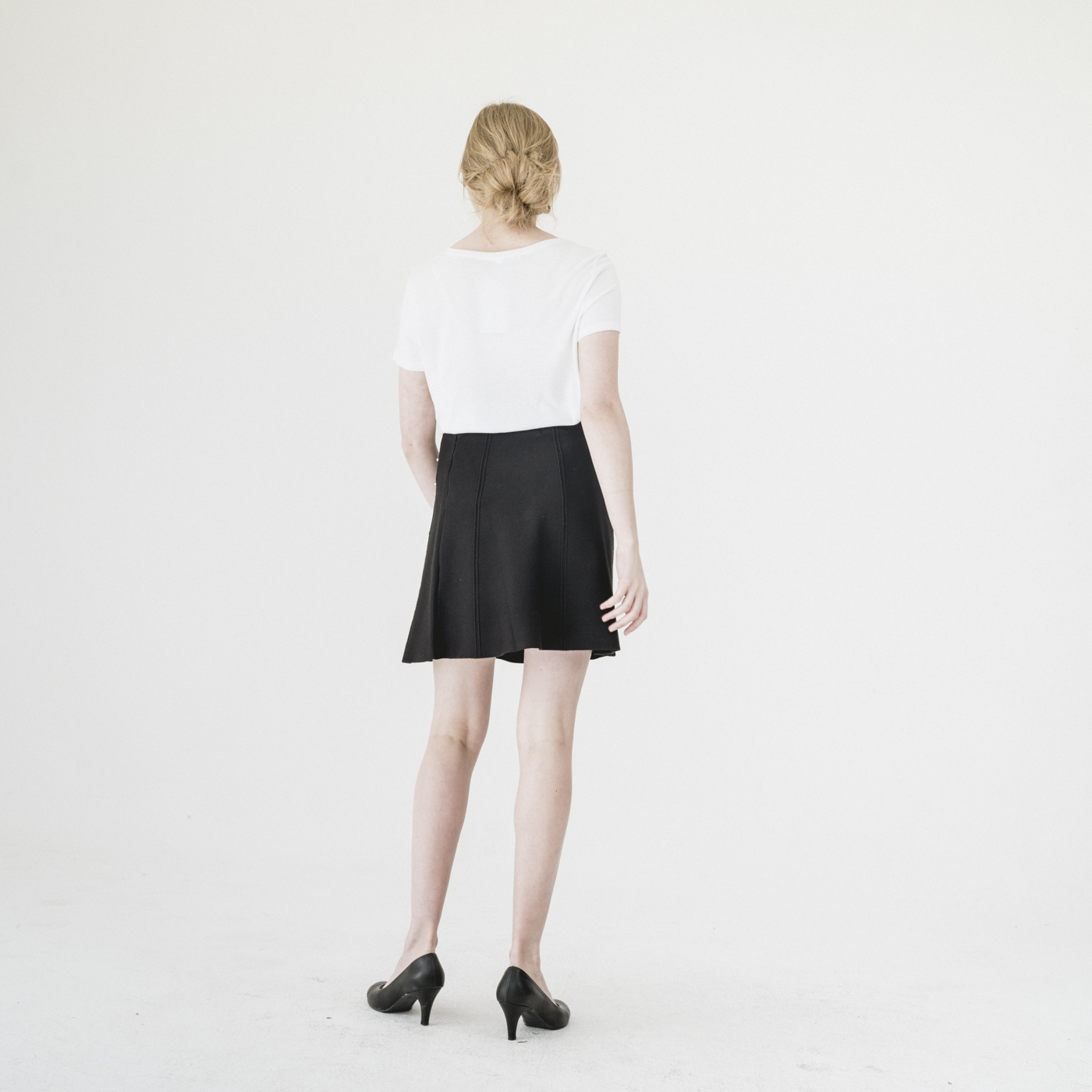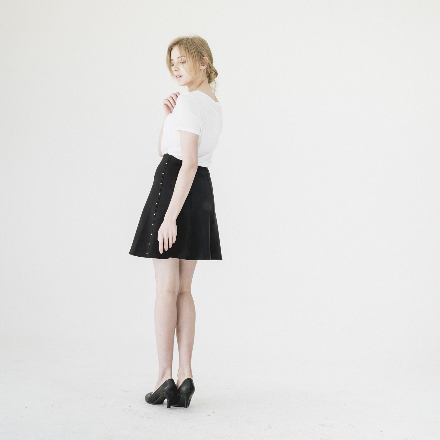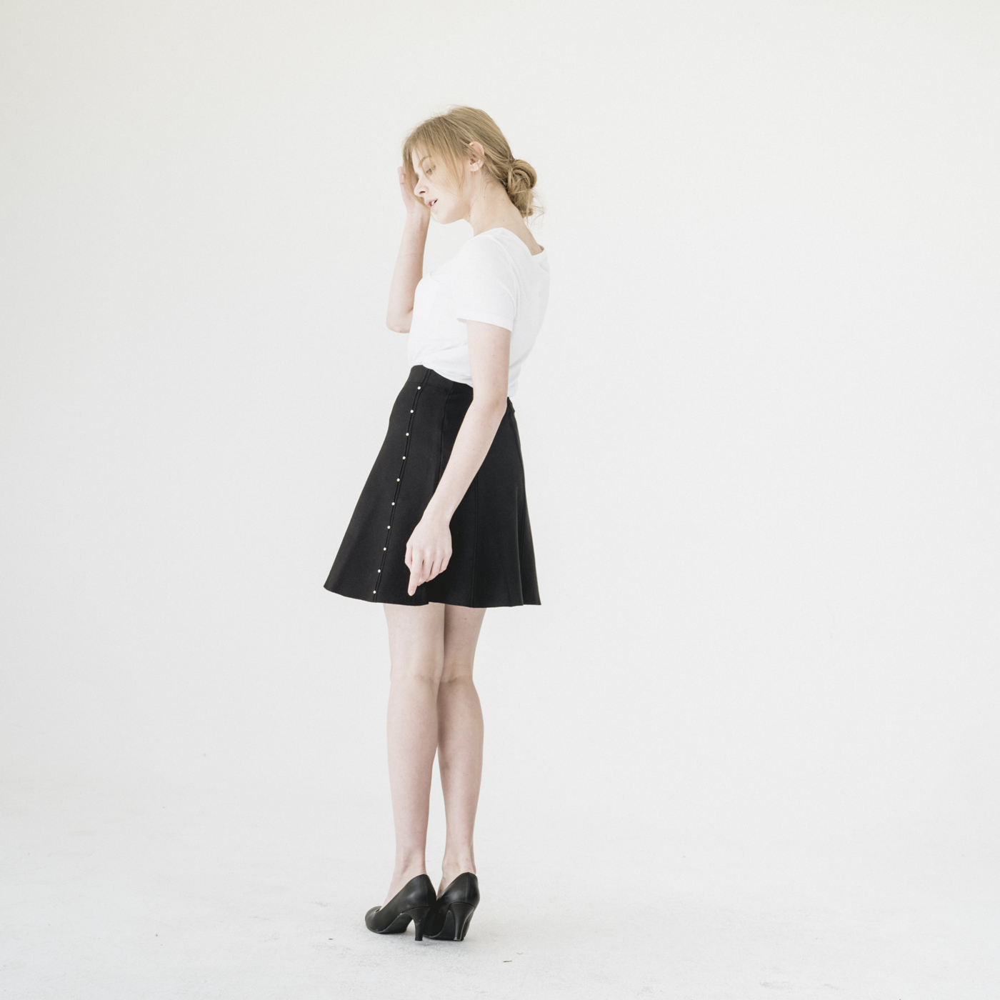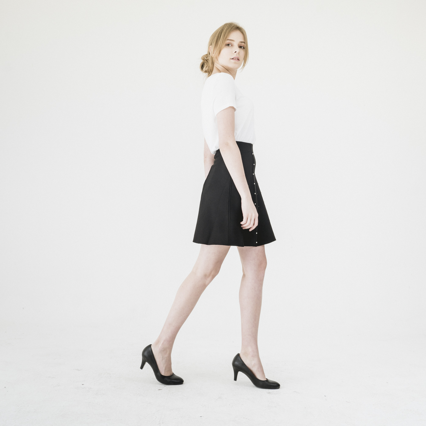 진주 포인트 디자인의 고급스럽고 슬림한 스타일의 니트 스커트입니다.