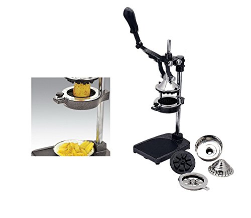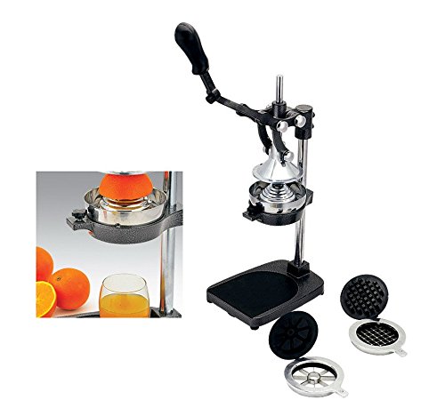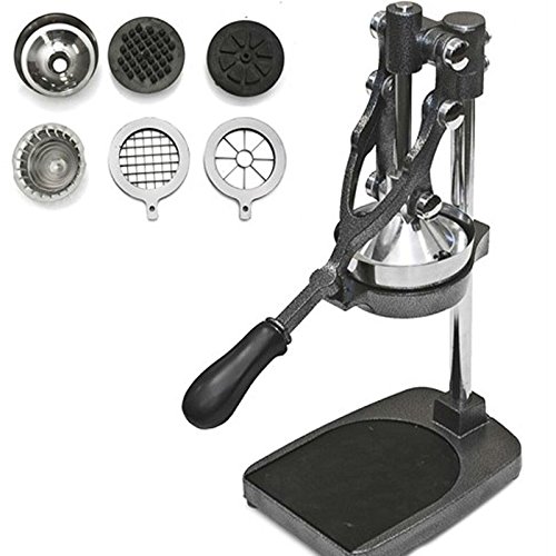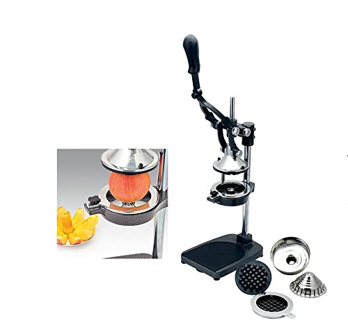 -. Feature : Professional fruit juicer, cutter and potato chipper. Made of cast iron and 18/10 stainless steel / Great for squeezing the most juice possible out of oranges, grapefruits, lemons, limes, and more / Comes with 1). cone and funnel for juicing 2). 8-slices apple cutter blade set and 3). potato chipper set. / Fast and easy to use, make 25 French fries at a time with a potato or 8 slices of apple / Hand wash cone, funnel and blade parts