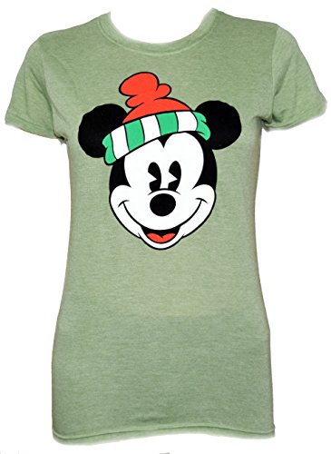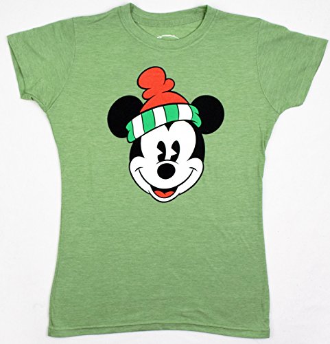 Disney Classic Christmas Mickey Mouse Face Juniors T-shirt (Medium, Green)