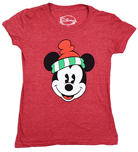 Disney Classic Christmas Mickey Mouse Face Juniors T-shirt (Medium, Red)