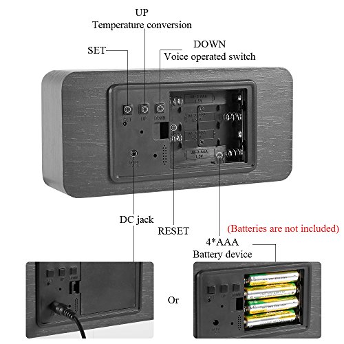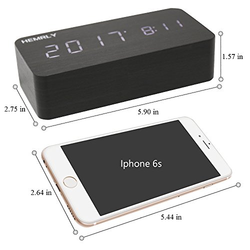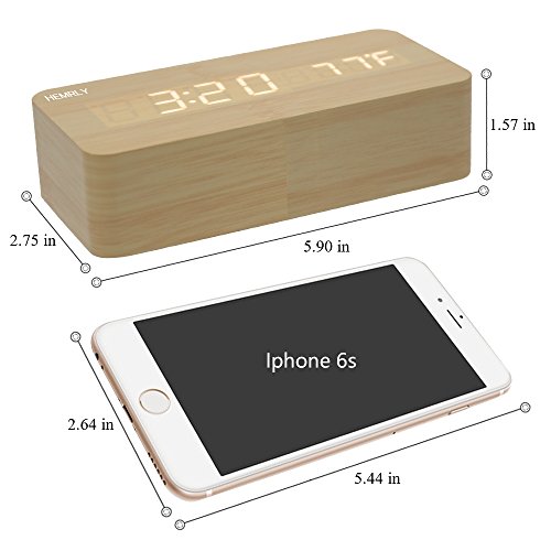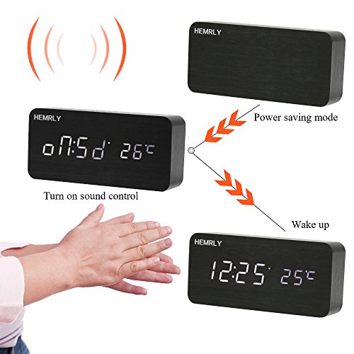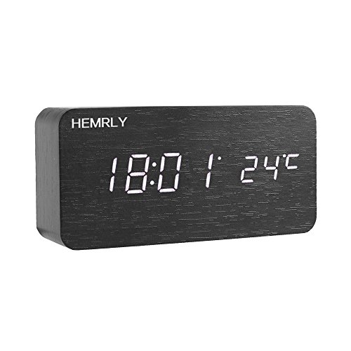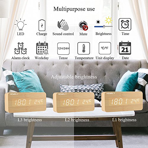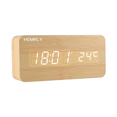 Digital Alarm Clock, HEMRLY Adjustable Brightness Wooden Alarm Clock Voice Control Desk Clock Large Display Time Temperature USB/Battery Powered For Home, Office, Kids (Newest Version)