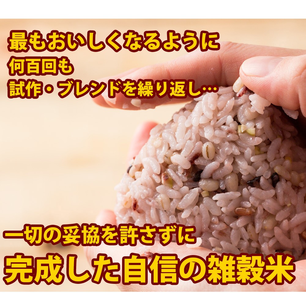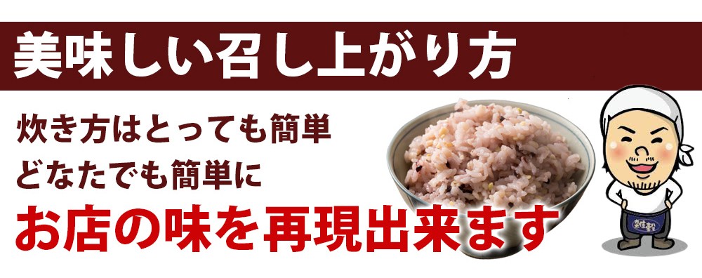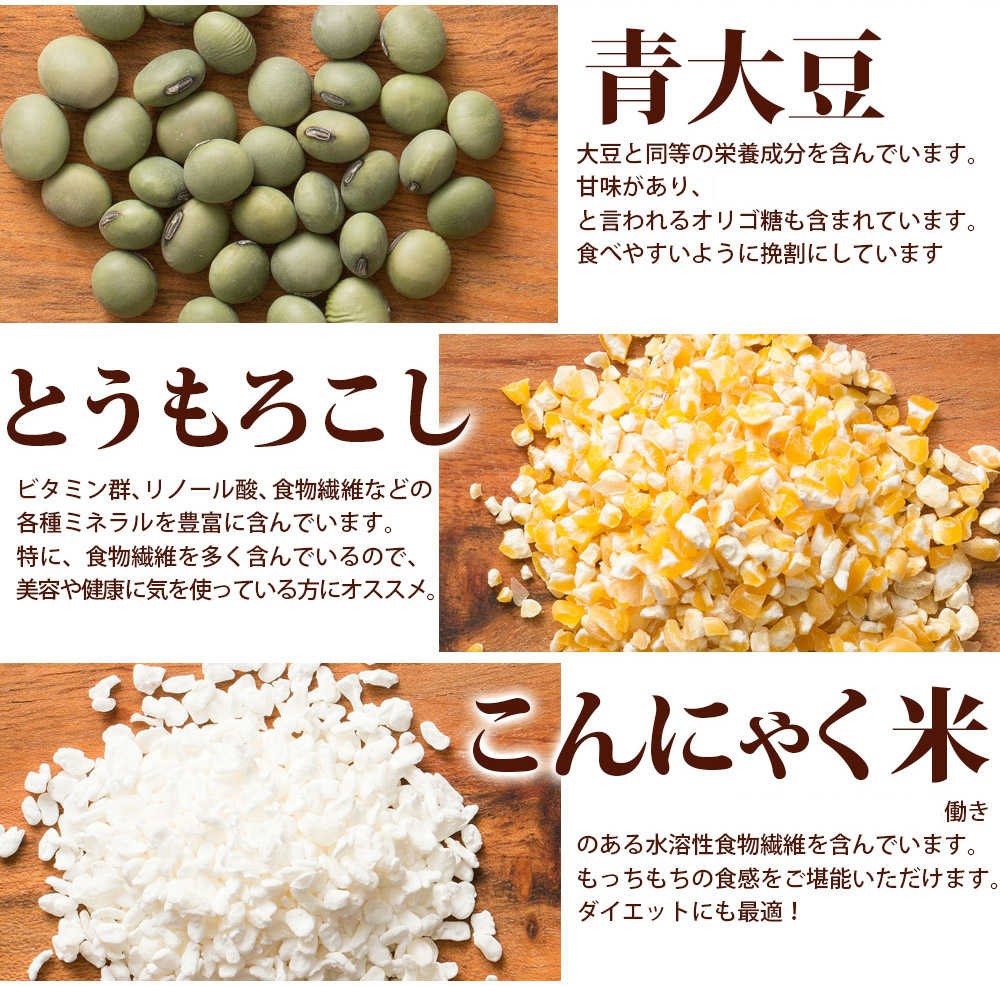 | 原材料 | もちひえ もちあわ もちきび アマランサス キヌア 高きび 挽割とうもろこし 丸麦 胚芽押麦 はだか麦 ハトムギ ビタヴァーレー 黒米 赤米 緑米 発芽玄米 もち米 挽割大豆 挽割黒大豆 挽割青大豆 挽割小豆 炒り胡麻 こんにゃく米 |