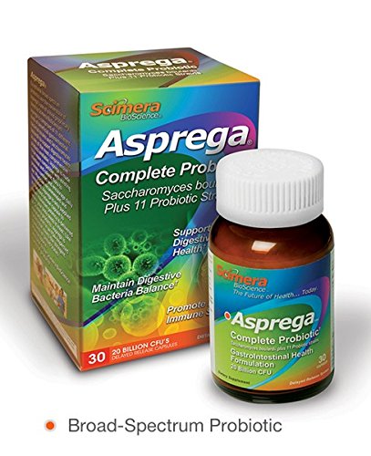 - In addition to the delayed release capsule and the glass container, Asprega contains a propriety blend of twelve (12) beneficial yeast and bacterial strains that are normal to the intestinal flora. Scimera Bioscience feels that this probiotic, supplied at 20 billion CFU?s will provide improved results and complement a daily regimen to ultimately benefit the patients most*.