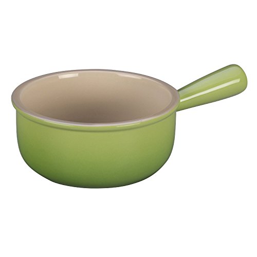 Sleek and stylish, this French-onion soup bowl by Le Creuset brings both beauty and versatility to any kitchen collection. The charming 16-ounce bowl, which measures approximately 6-2/5 by 4-1/5 by 2-1/2 Inch, provides a cylindrical shape with a flat base and tall sides--perfect for keeping soup hot at the table. Use it for a variety of favorite soup recipes, including the classic French Onion--complete with caramelized onions, flavorful broth and a hearty slice of French bread.Feature