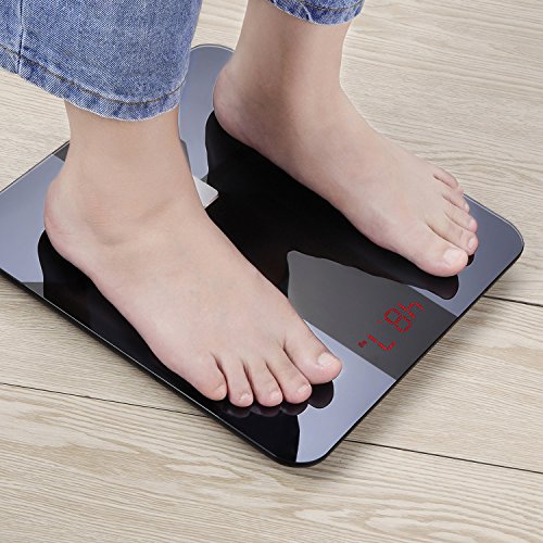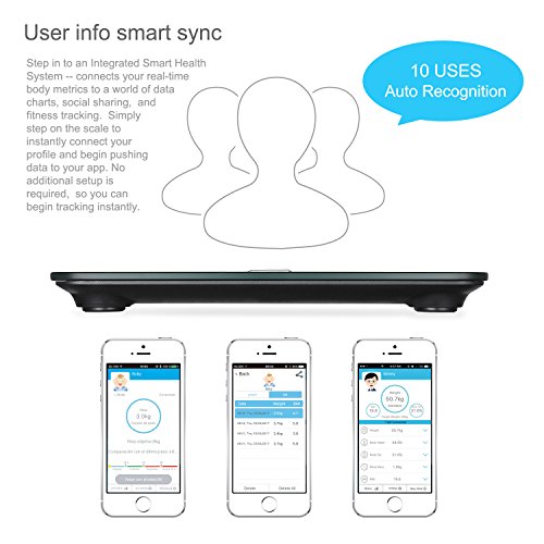 -. Feature : 【Multi-function】utilize BIA technology to offer precision body measurements including body weight, body fat, body water, muscle mass, BMI, BMR(KCAL), bone mass and visceral fat / 【Multi-user use】three modes for choose and you can save data for up to 10 different users. It automatically sync your data with app when weigh in and it has smart user recognition / 【High precision】strain sensor with high precision and ITO conductive surface technology contribute to an accuracy of 0.1kg/0.2lb. And it has capacity up to 180kg/400lb / 【Product construction】utilize LED display of 27*80mm and tempered glass weighing platform to ensure high quality. Step-on technology allows to get a weight reading when you step on / 【Wide compatibility】for iOS: iPhone 4s/5/5s/6/6s/7 or later, iPad 3/iPad mini or later; for Android: Android 4.3 or later; has overload and low power indication
