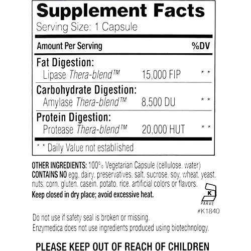 EXCLUSIVE THERA-BLEND: Thera-blend is an exclusive process that combines multiple strains of enzymes that work in various pH levels. Amylase Thera-blend is responsible for breaking down starch and carbohydrates into smaller sugars, while lipase Thera-blend helps the body break down fats, and protease Thera-blend helps break down proteins.
