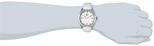 Stainless steel case with a white leather strap. Fixed silver-tone bezel. White dial with green hands and green index hour markers. Minute markers around the outer rim. The Lacoste crocodile appears below the 12 o'clock position. Dial Type: Analog. Luminescent hands and markers. Quartz movement. Scratch resistant mineral crystal. Push / pull crown. Solid case back. Case diameter: 44 mm. Case thickness: 12 mm. Band width: 20 mm. Tang clasp. Water resistant at 50 meters / 165 feet. Functions: hours, minutes, seconds. Casual watch style. Lacoste Montreal White Dial White Leather Mens Watch 2010595.