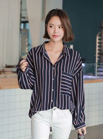 カジュアルながらも落ち着いた配色が大人っぽい雰囲気の長袖ストライプシャツです。