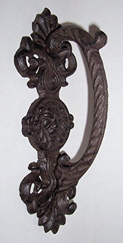 -. Feature : Large cast iron door handle - Fancy Victorian style design - For barn door, Large cast iron door handle - Fancy Lions Head design - For barn door, cabin, cottage ,home or anywhere you need a heavy large pull or anywhere you need a heavy large pull / Made of durable cast iron - Black cast iron handle has a rusty patina that highlight the details. - Hand by 2 screws - Not included / Provide a sturdy door handle for all types of doors - Rustic iron look - Old country western look / Approx Dimensions: 9 1/4 in long X 2 1/2 in width X 3 in projection - Can also, be used on a barn, shed, garage, and etc - Indoor or outdoor use - New never been used / Note: To see cast iron discounted products +++ Search on Amazon: ABC Products Cast Iron