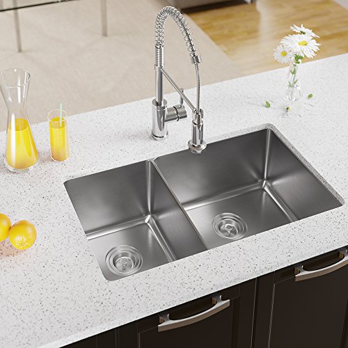 CONTEMPORARY STYLING -- Subtle ¾” radius corners provide extra sink space and a soft appearance in this broad, double-offset-bowl made of shimmering stainless steel