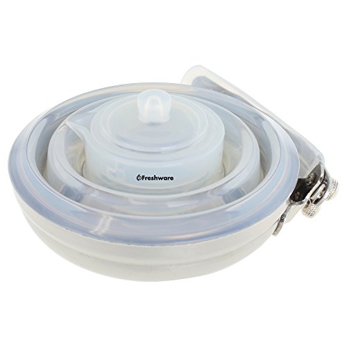 The space saving Freshware PT-100 Collapsible Silicone Stainless Steel Water Kettle/Tea Pot is the perfect way to have coffee, tea, hot cocoa, soup, and more while enjoying the outdoors. It is your best companion for camping and hiking. The flexible kettle boils up to 5 cups of water in just minutes on a gas or electric stovetop. The built-in locking, heat-resistant silicone covered handle makes heating liquids safe and easy. Neatly compressing to less than 2.5 inches for convenient storage the flexible kettle is constructed of 100% pure, premium quality food-grade silicone and stainless steel, which meet US FDA and European LFGB safety standards (BPA, PVC, and Phthalate FREE). Dishwasher safe.