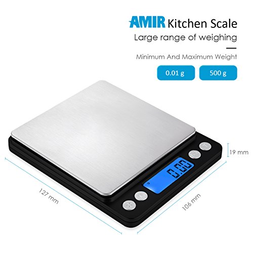 - High-Precision & Wide Range: AMIR kitchen scale built with high precision sensor system, provides you with instant and accurate results from 0.01g (0.001oz) to 500g. Easy to clean and use, make it an ideal to measure jewelry, medicine, and cooking ingredients with refined accuracy.