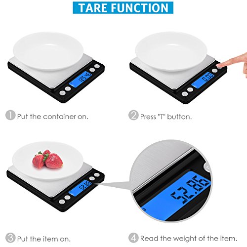 - Multi-Functions: Built with a clear blue back-lit LCD screen, the cooking scale can convert measurement results between in g, tl, oz, ct, and gn in seconds. Comes with two trays (13cm, 10cm), which can be used as protectors or scale trays. Meet your demand of measuring different things.