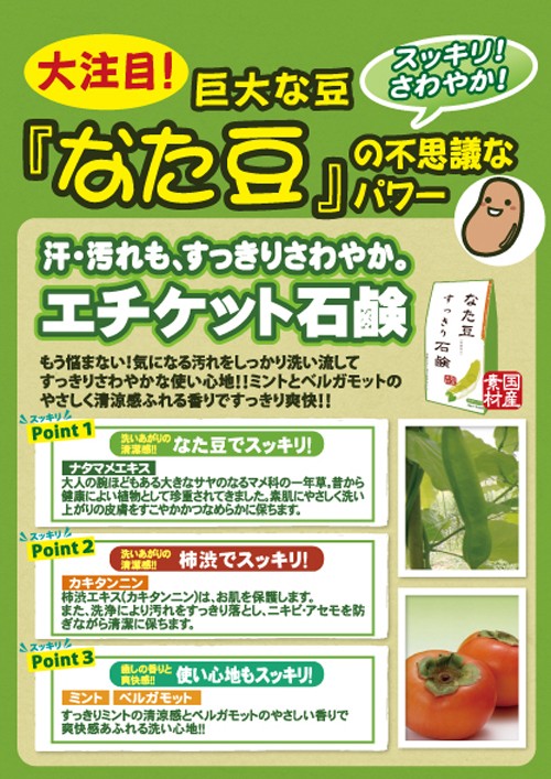 | 成分 | 石けん用素地、グリセリン、ナタマメ種子エキス、カキタンニン、ローヤルゼリー、水、PEG-75、オリーブ油、水溶性コラーゲン、銅クロロフィリンNa、EDTA-2Na、EDTA-4Na、水溶性プロテオグリカン、フェノキシエタノール、クエン酸、クエン酸Na、香料(ミント) |