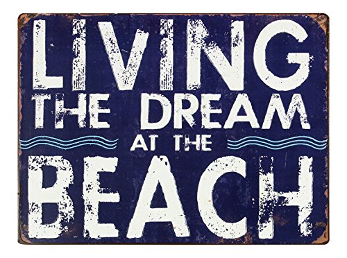 Living the Dream At the Beach Blue and White Punched Tin Wall Sign 13 Inch