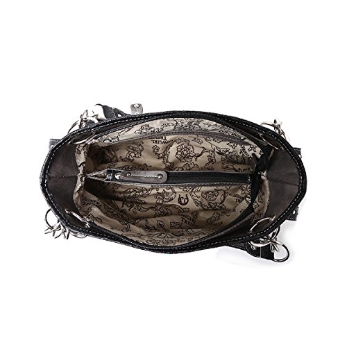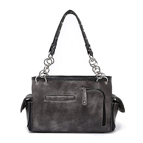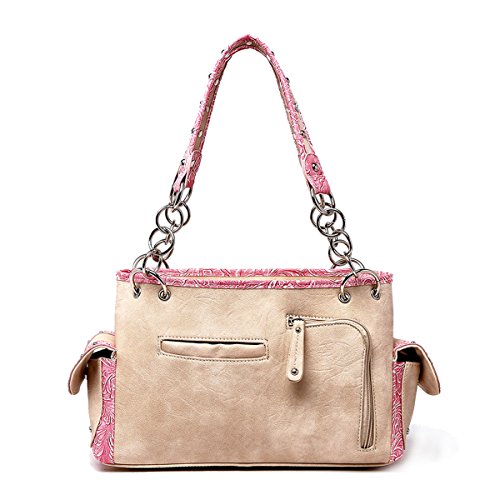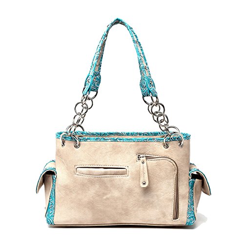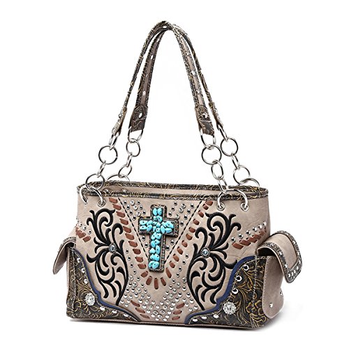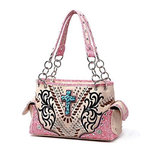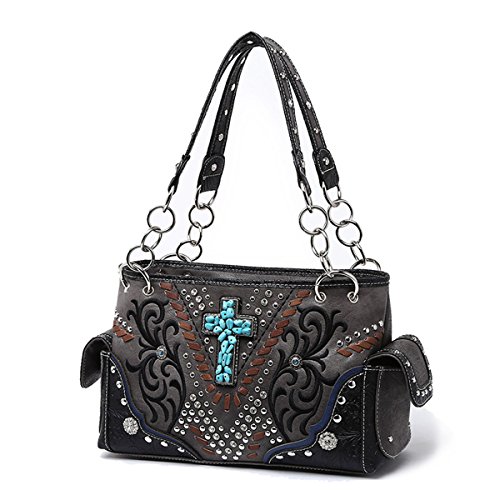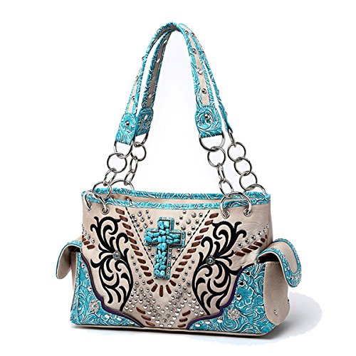 -. Title : Western Handbag - Multi Turquoise Stone Cross Stitch Embroidered Concealed Carry Shoulderbag with Stud and Rhinestone Accents
