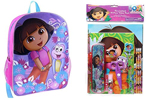 -. Feature : Dora Backpack Bundle Includes 12 Pieces: / Dora 16 inch backpack features a zipper closure, two mesh side pockets, adjustable shoulder straps, a small hang loop for locker or closet hanging, spot clean, imported. / Dora Stationery Set includes the following Dora themed items: 1 portfolio folder, 1 spiral notebook, 1 round sharpener, 1 eraser, 3 pencils with erasers, 1 six inch ruler, 1 pair of scissors, 1 glue stick and 1 pencil case.