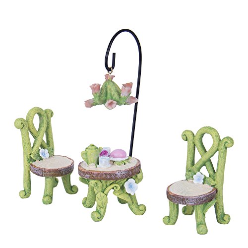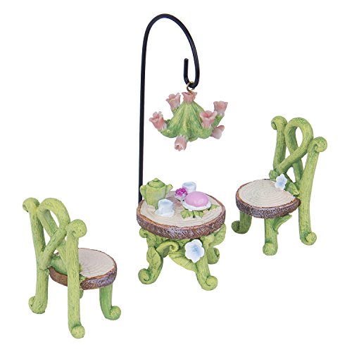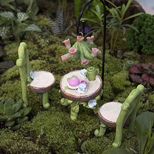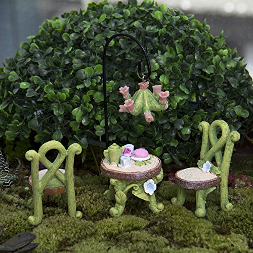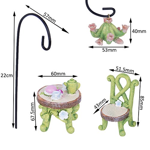-. Feature : Made of weather-resistant resin, with hand-painted details. / Fairy garden set includes:two chairs,table,flower lamp and lamp holder / It built a fairy world for you when the miniature ornament would work well in a container mini garden or in a terrarium. / It can be used to make a micro garden,as a good gift for children,lover,friends and family. / The images shot by SLR, it looks larger on the photo than in real lift, please check the size before purchase.