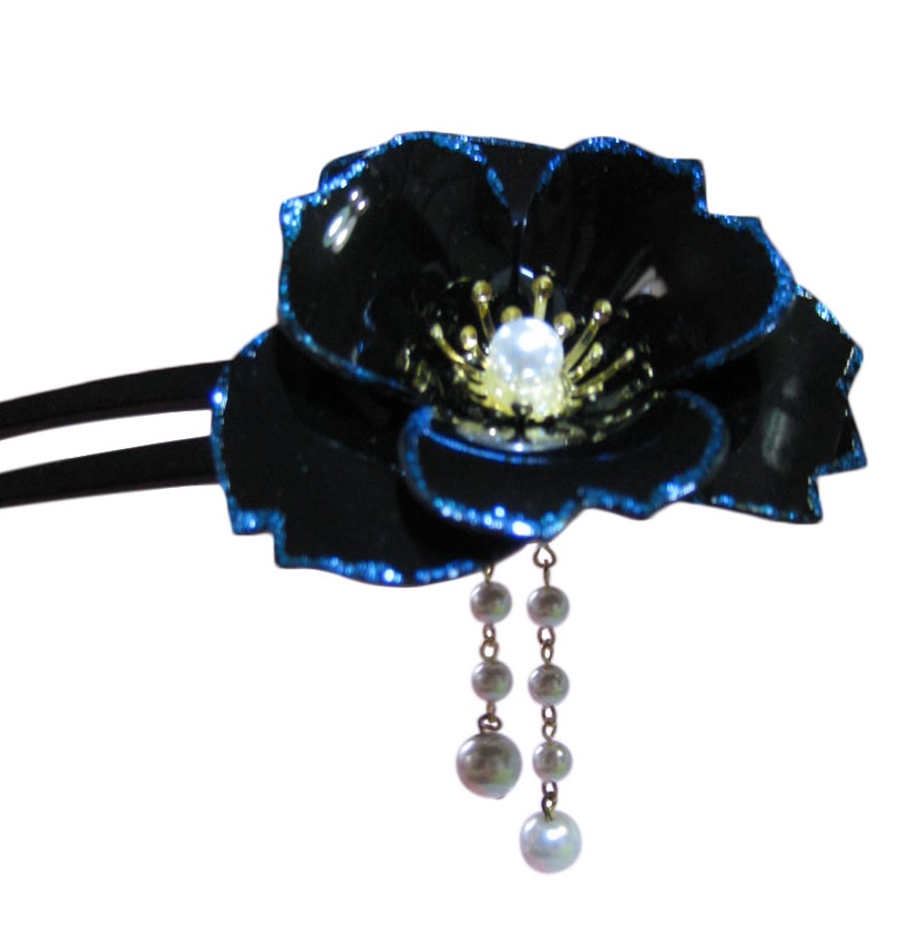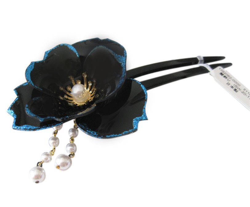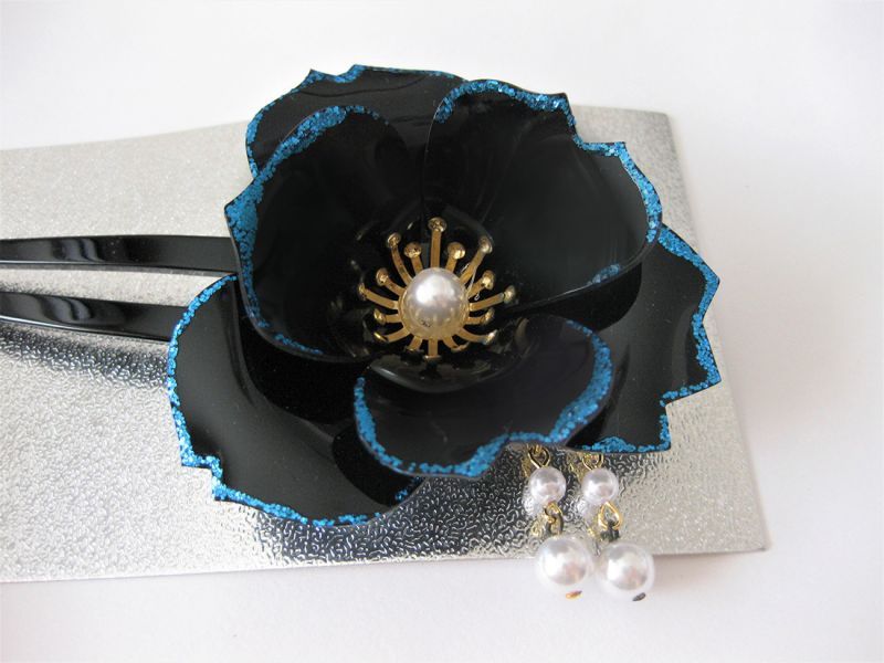 光沢のある黒い花びらにブルーラメの縁取りが美しいかんざしです。