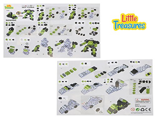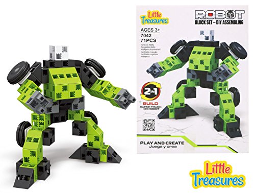 -. Binding : Toy -. Brand : Little Treasures -. EAN : 0190447008544 -. Edition : Interlocking Blocks -. Feature : TRUCK ROBOT: Like in Transformers movie this toy set block includes 2 in 1 robot transformer that changes into super heavy truck or a gun trotting soldier robot in cubical blocks with wheels. / ALTERATION: Preschoolers convert this toy set into a super truck or into a gun canon shooting robot keeping them enthralled for long hours in pretend robotic fun. / ADVANCE: Kids have inherent desire for novel electrifying knowledge and this toy set energized it to support their sensory and psychological development while they envision diverse designs and blocks to build transformer robot. / GRAND: Green and black tones of the blocks give a magnificence dominant being to the assembled transformed machines. / The Toy play set is packed in a detailed, colorful box with instructions included! 100% satisfaction is our goal! -. Genre : compatible toy -. ItemPartNumber : 10854 -. Label : Little Treasures -. Manufacturer : Little Treasures -. MPN : 7042 -. PackageQuantity : 1 -. PartNumber : 7042 -. ProductGroup : Toy -. ProductTypeName : TOYS_AND_GAMES -. Publisher : Little Treasures -. Studio : Little Treasures -. Title : Super Truck Transformer Brick Click Building block 71 pieces smart toy set for kids education playtime -. UPC : 190447008544