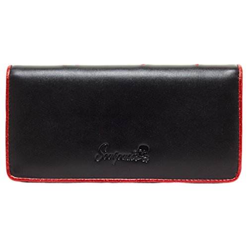 Product Description - Material: Vinyl - Dimensions: approx.18 x 2,5 x 9 cm - Spiderweb embroidery on front - Embossed Sourpuss logo on back - Glitter border and lining - Magnetic closure - 5 card slots - 2 bank note slots - One coin pocket with zipper