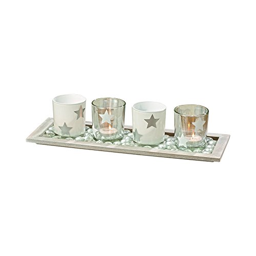 - 6 EASY PIECES Set your table with starry style with the Cape Cod Centerpiece. An ideal accent piece with distressed details, this centerpiece is perfect to place top dining and coffee tables. Featuring a silver and white theme, it comes with 1 wooden tray to hold the collection of glassware that includes 2 white and 2 silver star decorated glass votive candle holders plus 1 packet of clear stones.