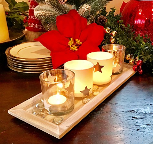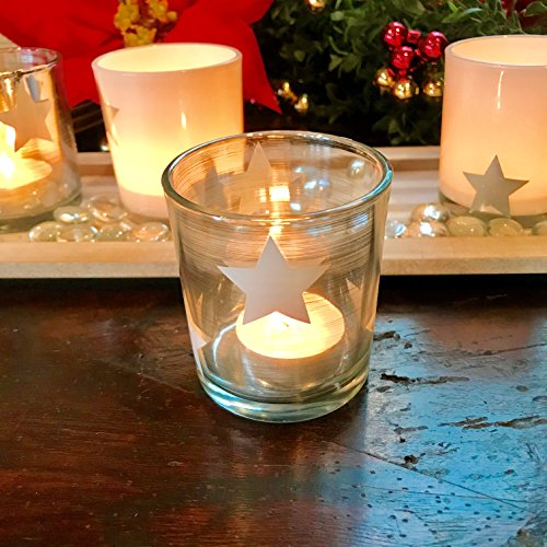 - SOLD AS A SET OF 6 the following items are included in the box: 4 votive candle holders decorated with stars, 1 wooden tray, and 1 package of glass stones.