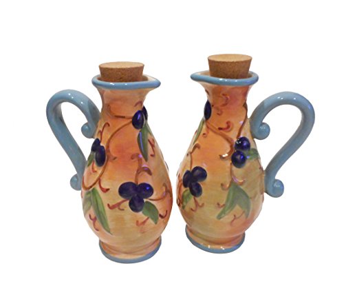 -. Title : Tuscan Style Oil and Vinegar Set, Olives, Leaves with Cork Stoppers, Set of 2