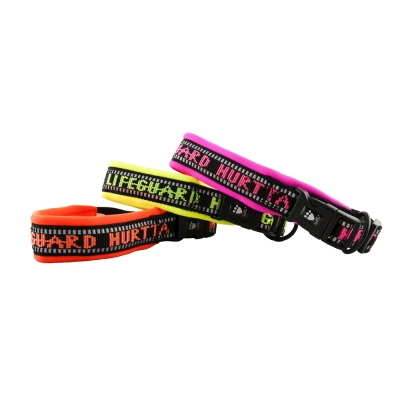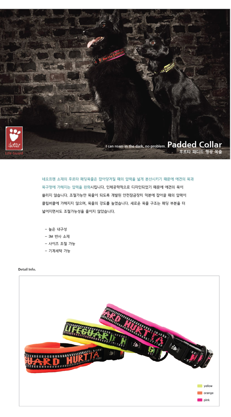 야간 안전에 중점을 두어 리플렉터가 광범위하게 사용된 형광색 목줄