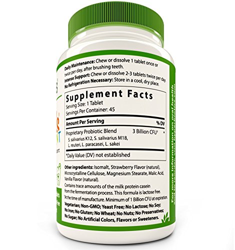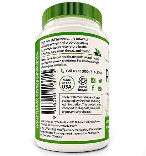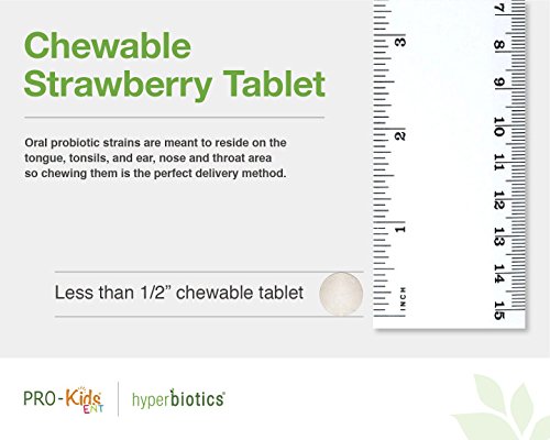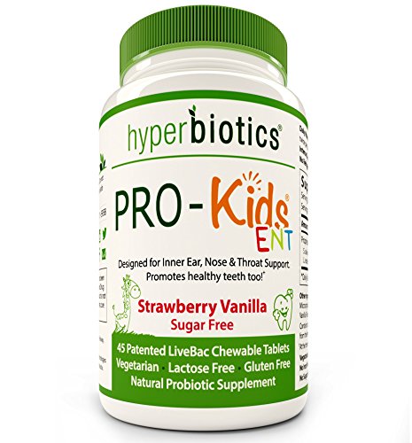 -. Binding : Health and Beauty -. Brand : Hyperbiotics -. EAN : 9506000113715 -. Feature : FORTIFY YOUR CHILD'S FIRST LINE OF DEFENSE. The mouth is the gatekeeper of our health and its beneficial bacteria plays a critical role in our immune system's first line of defense. The strains in PRO-Kids ENT produce natural antibacterials that balance the flora in the oral cavity and allow room for the good bacteria to thrive. Studies show that S. salivarius K12 can enhance your immune function within just 24 hours! / PRIORITIZE THROAT HEALTH WITH ALL YOUR MIGHT. We all want our kids to feel their best and helping to protect their throat often keeps their entire upper respiratory system in optimal condition. When beneficial bacteria are plentiful in the throat and pharynx, they create a barrier against invaders that can lead to unpleasant ear, sinus and chest issues. K12 is known as nature's throat guard as it was discovered in the mouth of a healthy child who had never suffered throat issues in his life. / KEEP THOSE INNER EARS HAPPY. We know it all too well: by age 3, up to 80% of children have experienced inner ear issues and by age 7, many have become recurrent. The good news? Clinical studies have shown that K12 colonization extends beyond the oral cavity to also include adenoid tissue (the accomplice in most ear issues). This finding means that, as parents, we now have a natural and proactive way to protect our child's health and break this disheartening cycle. / TURN DENTIST VISITS INTO A FUN EVENT. The probiotic S. salivarius M18 produces an enzyme that helps dissolve and loosen the formation of biofilm and sticky deposits around the teeth. In fact, one study showed that 100% of children had a significant improvement in their dental health when the the strain M18 colonized in their mouth. / HELP YOUR FAMILY LIVE MORE HEALTHY DAYS. PRO-Kids ENT will help reinstate microbial balance for your little one (this is particularly important after antibiotic use), and their body will simply function better - which often leads to a reduction in doctor visits, days off school and, of course, days off work for parents looking after children who don't feel their best. -. IsAdultProduct : 0 -. Label : Hyperbiotics Probiotics -. Manufacturer : Hyperbiotics Probiotics -. MPN : Hyperbiotics PRO-Kids ENT -. PackageQuantity : 1 -. PartNumber : Hyperbiotics PRO-Kids ENT -. ProductGroup : Health and Beauty -. ProductTypeName : HEALTH_PERSONAL_CARE -. Publisher : Hyperbiotics Probiotics -. Studio : Hyperbiotics Probiotics -. Title : PRO-Kids ENT: Children's Oral Probiotics (Chewable & Sugar Free) - Uniquely Formulated for your Child's Oral & Ear Nose and Throat Health (Strawberry Vanilla) - 45 Chewable Tablets