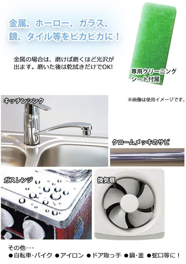 | シンク周り、ガスレンジや換気扇に!!磨くだけでガンコな油汚れ、ベトつきが落とせます。磨いた後は乾拭きだけでOK!!サビとり後の副作用がなく、サビ止めの役目になります。金属の他にもホーロー製品、ガラス、鏡、タイルと幅広く使用できます。 |