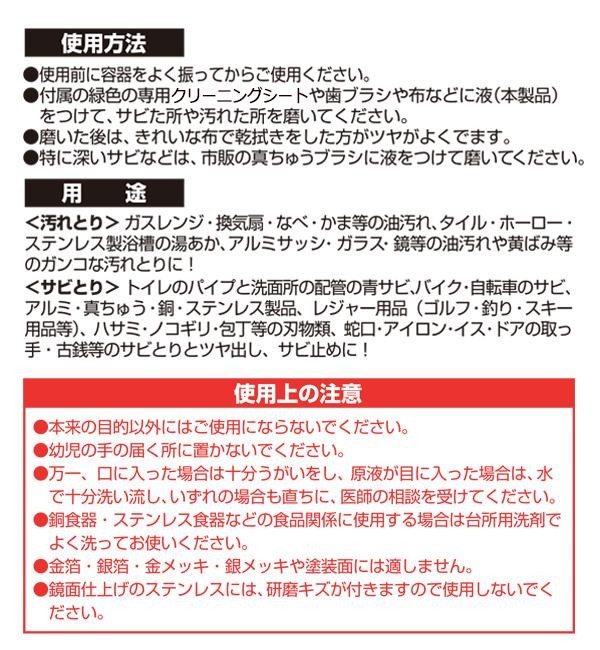 シンク周り、ガスレンジや換気扇に!!磨くだけでガンコな油汚れ、ベトつきが落とせます。磨いた後は乾拭きだけでOK!!サビとり後の副作用がなく、サビ止めの役目になります。金属の他にもホーロー製品、ガラス、鏡、タイルと幅広く使用できます。 |