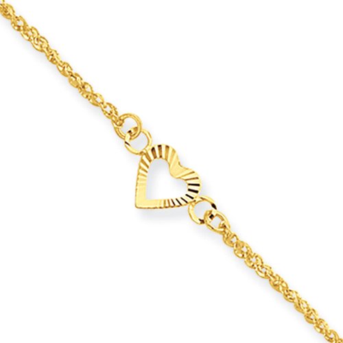 Anklets are a great way to add fun, flash and a feminine touch. This 9-10-inch adjustable ankle bracelet is crafted from polished and diamond-cut 14k yellow gold. It features a delicate 1mm width twisted link chain with three 6mm (1/4 inch) open-heart stations, a 1-inch extender for versatility and a spring ring clasp.Feature