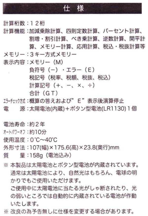 fk094igrjs消費税率設定変更可能なので、消費税率が変わっても大丈夫ですビジネスでも使用できる12桁表示ですサイズ個装サイズ:18×12×5cm重量個装重量:170g付属品保証書付取扱説明書(保証期間:1年間)製造国中国ソーラー電池&ボタン電池の2電源です消費税率設定変更可能なので、消費税率が変わっても大丈夫ですビジネスでも使用できる12桁表示です
