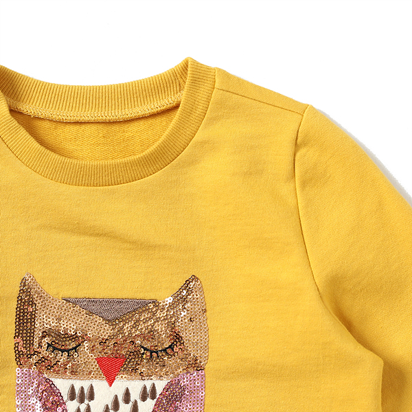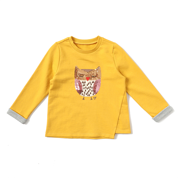상세설명-머스타드 컬러가 화사하게 돋보이는 기본 티셔츠로 깜찍한 부엉이 캐릭터가 포인트 입니다.
