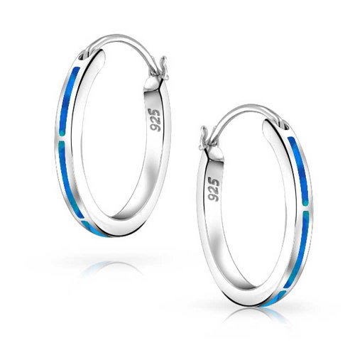 Discover the perfect accent to your summer wardrobe, a pair of sterling silver hoop earrings accented with Synthetic Blue Opal inlay. These small hoops are the perfect size for everyday wear but will still make a statement. A small silver hoop is inlaid with five Synthetic Opal stones in shimmering blue. A hinged ear wire with notch is easy to put on and stays secure all day long. At 2.5mm wide and 2.5mm thick these silver earrings are sturdy but not too heavy. These lovely 1 inch hoop earrings will look perfect on any woman. Buy them as October birthstone jewelry for someone special and she will be sure to be pleased.