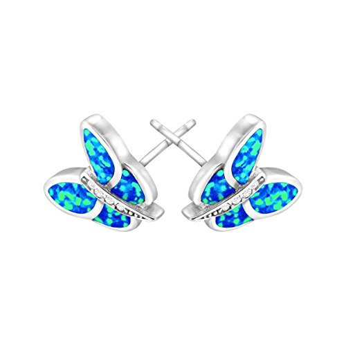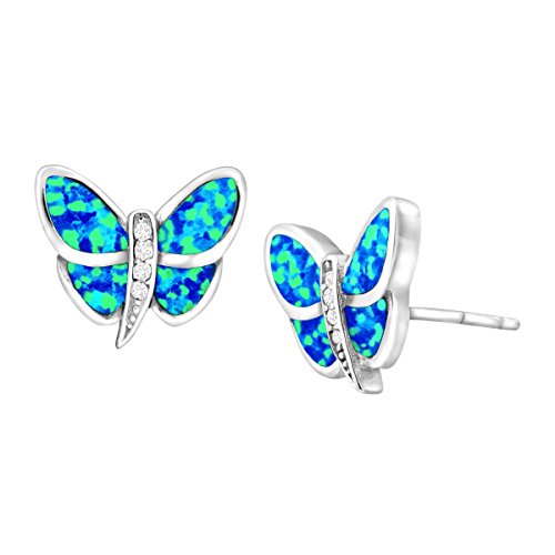 Fly away in this vibrant opal pendant! Panels of created blue opal contrast with created white sapphire at the center, set in a stylized butterfly form crafted in sterling silver. Pieces measure 7/16 by 1/2 inches.