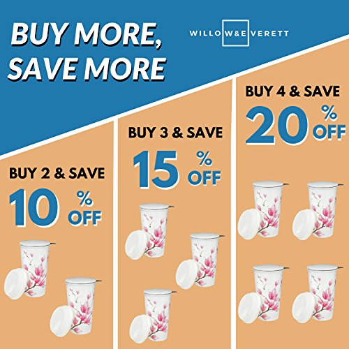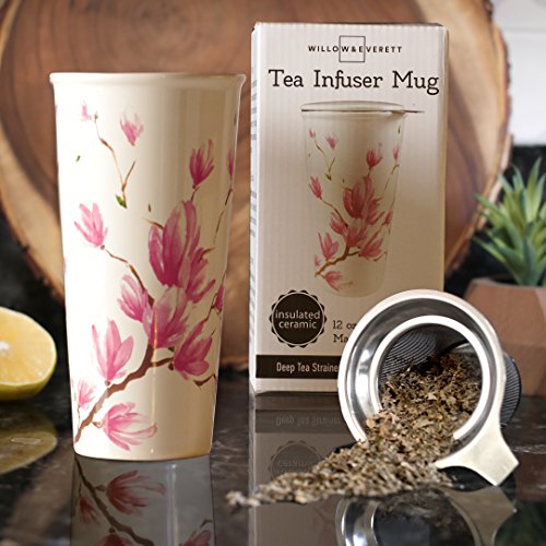 Studio : Willow Everett Publisher : Willow Everett Product Description Your 12oz ceramic travel tea mug holds more tea than smaller mugs and comes with a bonus silicone lid to help you transport your tea while you're on-the-go. The removable stainless steel infuser basket makes steeping loose tea easy. Simply add your favorite loose tea to the infuser, and pour boiling water over the basket then cover with the included ceramic lid to steep. When you reach your desired tea strength you are on your way to enjoying a generous 12oz cup of tea! 0