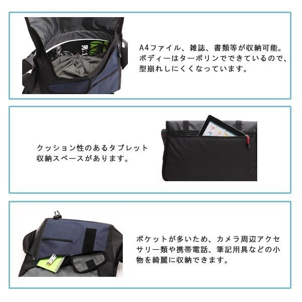 | さまざまなシチュエーションで活躍するカメラバッグで、A4ファイル、雑誌、書類等が収納可能です。反射板が付いているため、夜道でも安心してご利用いただけます。ターポリンとポリエステルのコンビネーションで作られており、アウトドア、タウンユース、旅行と様々なシチュエーションで活躍するメッセンジャーバッグです。 |