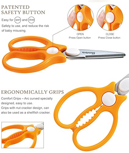 -. Binding : Baby Product -. Brand : Simba -. Feature : Made from premium quality SUS420 stainless steel,specially treated with anti-bacterial and anti-rusting properties. / Jagged blades design to prevent food from sliding when cutting / Patented Safety button to lock blades in place to prevent misuses / Handles are integrated with nut cracker design to help crack shells, crab legs, and ... / Including holder to keep the scissors clean when on the go. -. Label : Simba -. Manufacturer : Simba -. MPN : S1739 -. PartNumber : S1739 -. ProductGroup : Baby Product -. ProductTypeName : BABY_PRODUCT -. Publisher : Simba -. Studio : Simba -. Title : Simba Premium Portable Safety Food Scissors