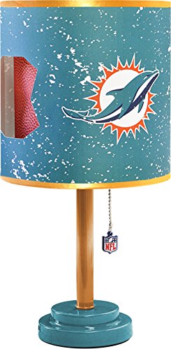 -. Feature : Vibrant NFL P.R.Int - perfect for any Dolphins fan! / Perfect for use on small or end tables / 40 Watt bulb is required - not included / Canvas die cut canvas lamp shade with metal base / Dimensions: 18" H x 9" W x 9" L