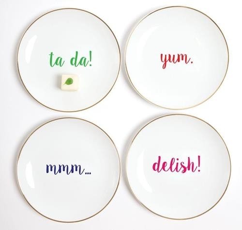 Studio : 8 Oak Lane Publisher : 8 Oak Lane Product Description Dessert or appetizer plates printed with a different expression - "MMM", "Yum", "Delish" and "Ta Da". Set of 4. Measures 7" in diameter. Made of porcelain; NOTE: Hand wash with mild soap. Not microwave or dishwasher safe. 0
