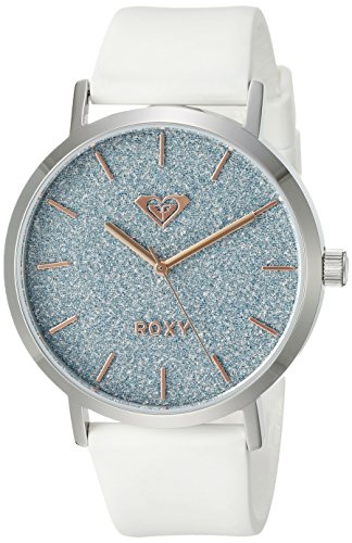 Silver-tone watch featuring round glittery dial with rose-tone hands, stick indices, and applied logoing at center