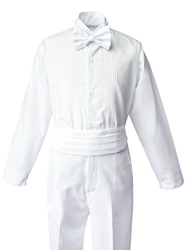 - Feature : Tuxedo: White single breasted jacket with smooth satin lapel; center vent tail; fully Lined. / Pants: Satin stripes line the sides of the pants; flat front with button closure, elastics back. Size 4T and smaller has elastic back only. / Shirt: White pleated front; long sleeve shirt (65% Polyester 35% cotton ). / Adjustable Around the Neck Satin Bow Tie. Satin Cummerbund / **This product is exclusively sold by Spring Notion.