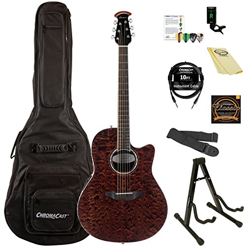 Studio : Ovation Guitars Publisher : Ovation Guitars Binding : Electronics Product Description The Celebrity Standard Plus series is your first step into the world of Ovation, with select figured tops, beautiful abalone appointments and first-rate sound, features and value. The Celebrity Standard CS28P-TGE guitar has the classic Super Shallow bowl Lyrachord cutaway body with a striking Figured Koa top featuring quarter sawn scalloped “X” bracing. We reviewed earlier Ovation bracing patterns extensively to arrive at this remarkable new design, which borrows from the past and is voiced for the present with natural tone and optimal response and power. Together, the body and top create the classic Ovation sound, resonating with full projection, remarkable note clarity and balance, and nuanced tonal complexity. The Quilted Maple top also has an elegant abalone rosette, ivory white binding and beautiful Natural gloss finish. Other premium features include an effortlessly playable neck with a natural satin finish and rosewood-veneer headstock, 20-fret bound rosewood fretboard with abalone microdot inlays, and a rosewood bridge. For great live sound, the CS28P-TGE features an Ovation Slimline pickup and OP-4BT preamp system with three-band EQ, volume/gain control, onboard tuner and low-battery light. 0