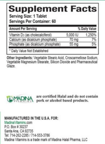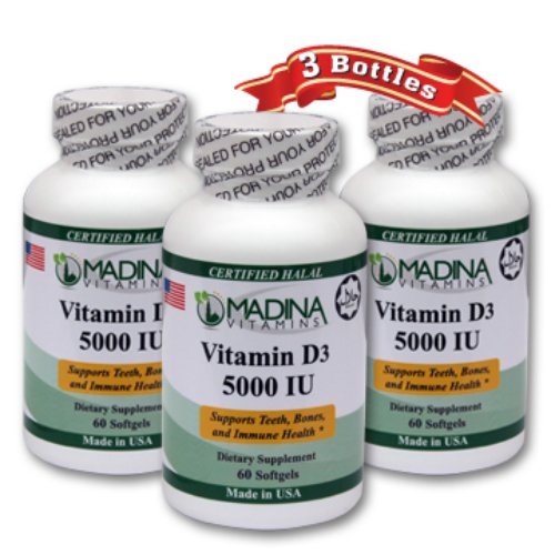 -. Binding : Health and Beauty -. Brand : Madina Halal Vitamins -. EAN : 0712096889161 -. Feature : Increases Calcium Absorption For Healthy Bones & Teeth / Promotes Healthy Cell Function & Boosts Immune System / Has Maximum Strength Support / Promotes Good Health / 60 Tabs Per Bottle (2 Month Supply) X 3 Package -. IsAdultProduct : 0 -. Label : Madina Halal Vitamins -. Manufacturer : Madina Halal Vitamins -. ProductGroup : Health and Beauty -. ProductTypeName : HEALTH_PERSONAL_CARE -. Publisher : Madina Halal Vitamins -. Studio : Madina Halal Vitamins -. Title : 3 X Halal Vitamin D3 5000 IU - Made in USA -. UPC : 712096889161