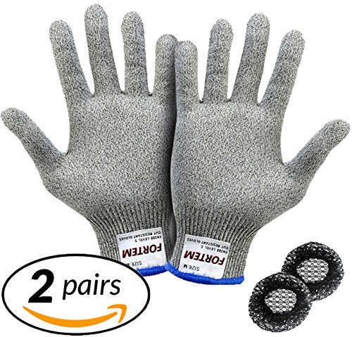 Cut Resistant Gloves By FORTEM - 2 PAIRS - Level 5 Protection, EN388 Certified Safety Gloves For Hand Protection, Kitchen, Outdoor Yard Work + 2 Hair Nets Included (Medium)