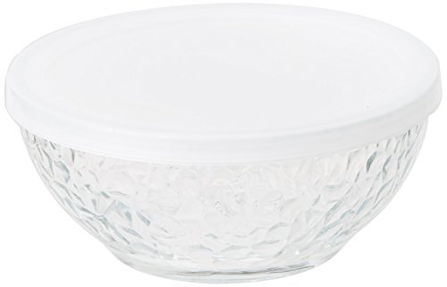 Serve and store salsa, salads, nuts, fruits, and more in these Libbey Frost bowls. Made with a glass base, this set includes four bowls and four white lids. Each bowl features a beautiful frost and textured design that is sure to compliment other table settings. Microwave and freezer safe, you can use them to store food for days and reheat it later. These bowls are also dishwasher safe for an easy to clean up.5" diameter x 2-1/2" H, with a 14.7 ounce capacity