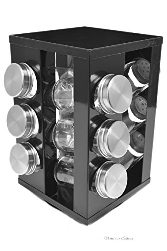 -. Brand : American Chateau -. EAN : 0881490101305 -. Feature : Retro Metal 12-Jar Revolving Spice Rack / Powder Coated Steel with Glass Jars and Stainless Steel Tops / No spices or Tags are included with this set / Countertop or Tabletop / Approximate Size: 9" x 5.5" x 5.5" -. Label : American Chateau -. Manufacturer : American Chateau -. MPN : IT4ND254 -. PartNumber : IT4ND254 -. ProductGroup : Kitchen -. ProductTypeName : KITCHEN -. Publisher : American Chateau -. Studio : American Chateau -. Title : Retro Black Revolving Rotating Carousel Spice Rack with 12 Glass Jars Bottles -. UPC : 881490101305